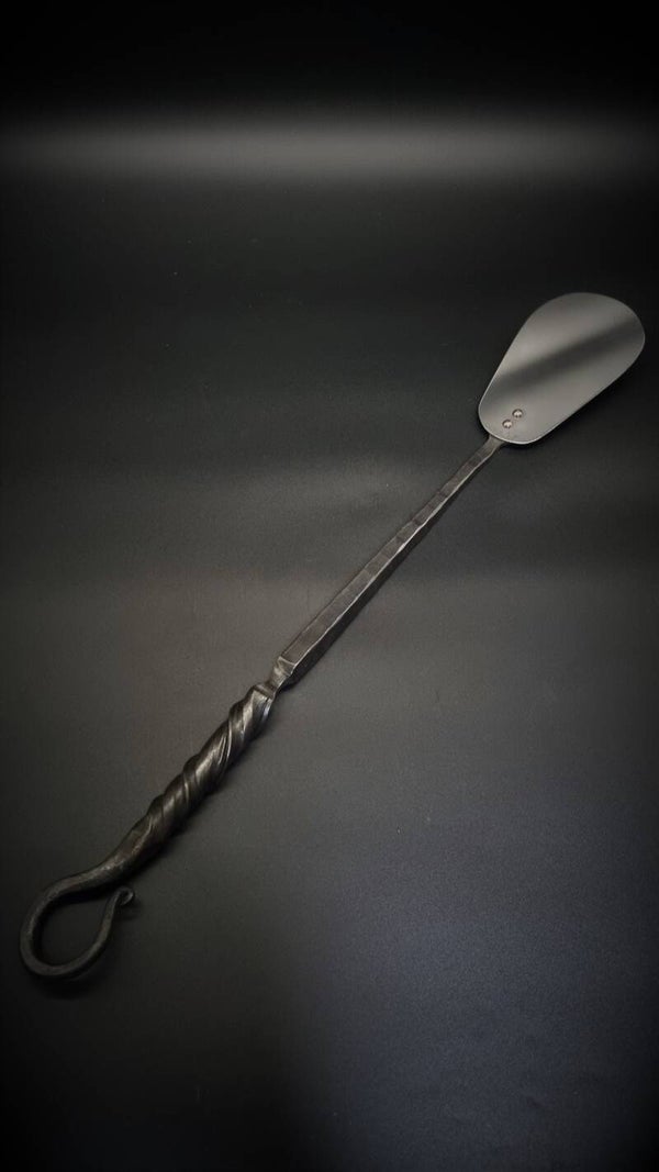 Measuring 50 centimeters in length and 8 centimeters in width, the spatula is equipped with a forged loop at the end for easy hanging.