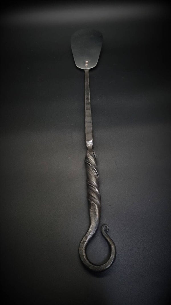 This spatula is meticulously forged from a single piece of iron. The handle features a twist design with a polished stainless flipper.